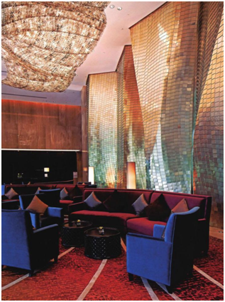 設(shè)計(jì)師用大自然中抽取各種自然元素,山、水、云、星混為一體,黃色、綠色、白色等營造出一種豐收、喜悅以及祥和的氛圍,有一種城市中的森林之感。大堂的裝飾非凡,包括一面黃金雕塑墻面和LED燈墻面,為酒店奠定了清新現(xiàn)代的風(fēng)格。在設(shè)計(jì)上墻為山、地為水、燈為云。以山為形的黃金墻仿佛太陽之光灑遍山間,閃耀金輝,天花吊頂是伴于山間的團(tuán)團(tuán)白云,仿佛流水般緩緩傾泄的花崗石紋地面與點(diǎn)點(diǎn)綠色相呼應(yīng)。