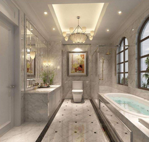 臺(tái)面與妝鏡是衛(wèi)生間造型設(shè)計(jì)的重點(diǎn),要注意面盆上方配的石英燈照明和鏡面兩側(cè)或單側(cè)的壁燈照明,二者建議做到都不缺。